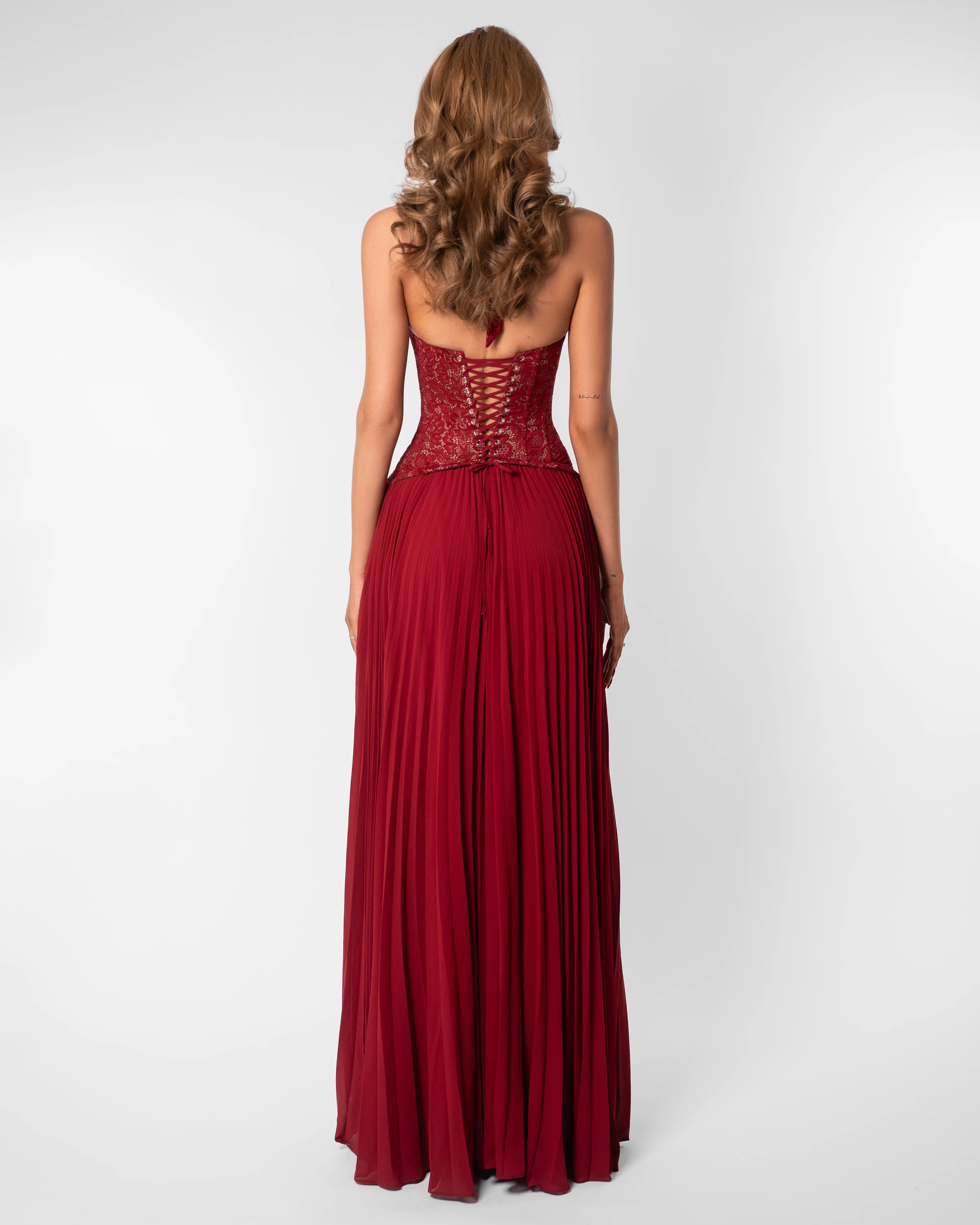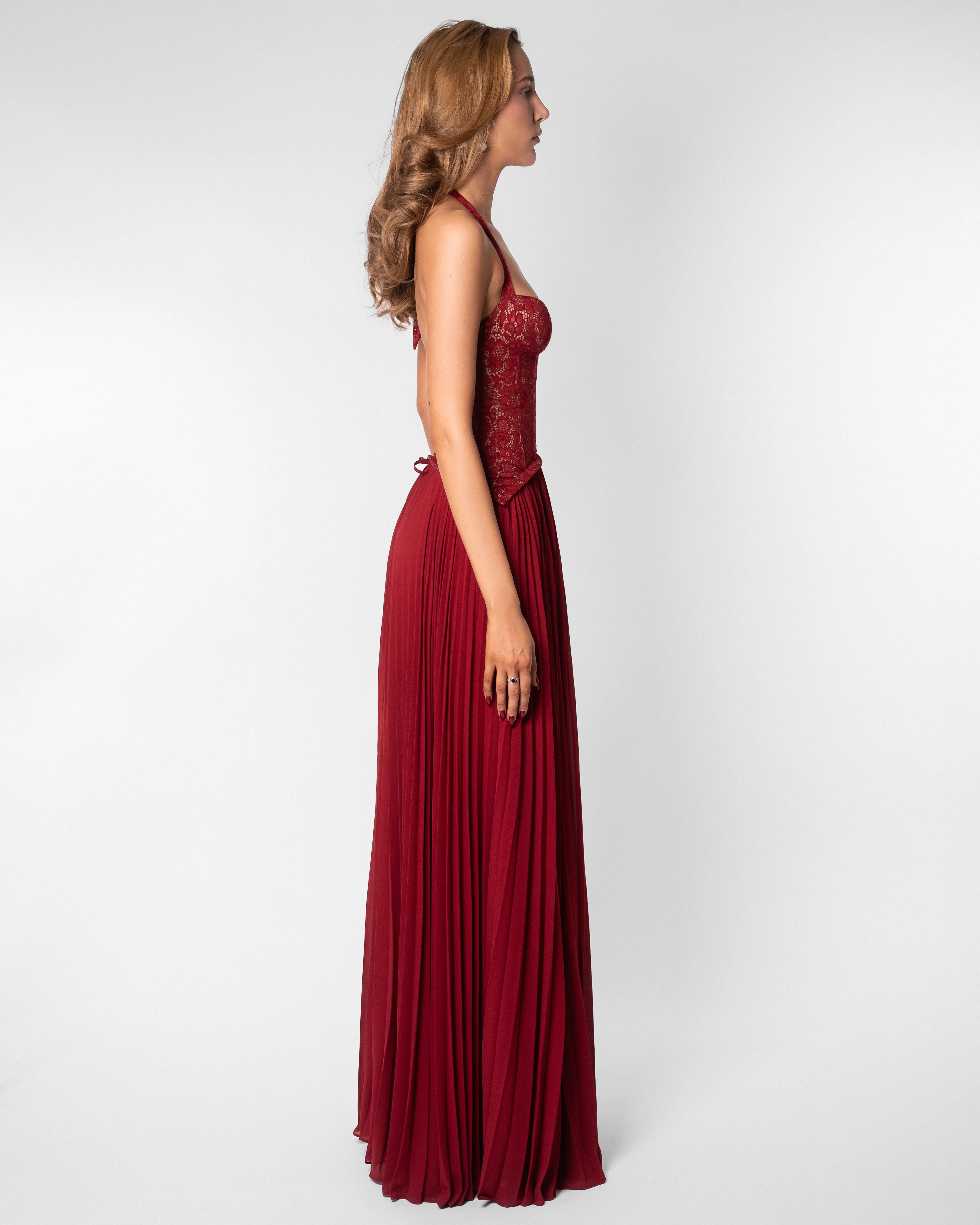 The Gaia Dress you love, now in dark red. Featuring our signature floral lace on the bodice with structured boning and a sculpting corset fit, it falls into a pleated skirt that drapes effortlessly and moves with ease.
